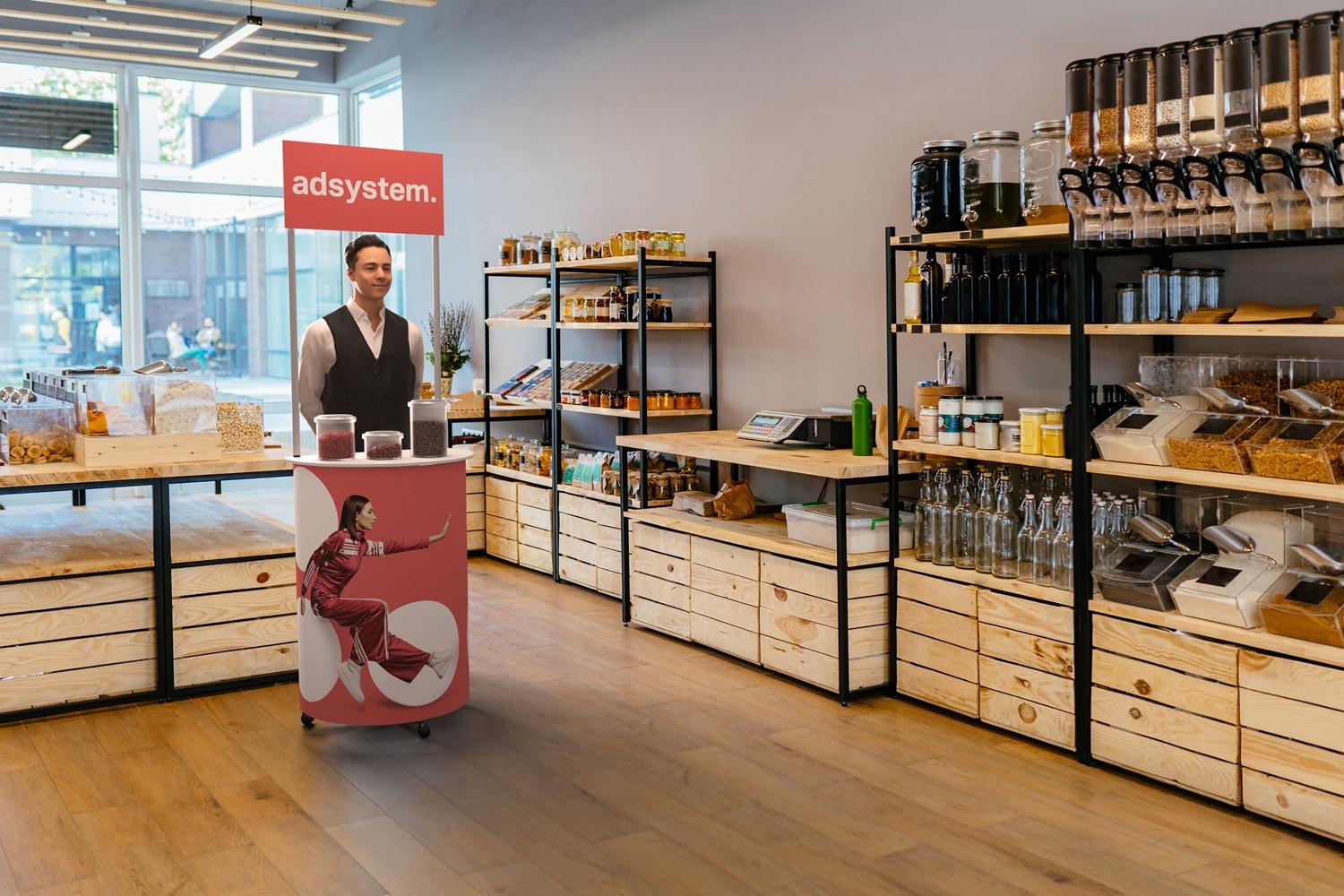 Degustações: Graças à sua construção robusta e montagem simples, o adBox Hit Mini é perfeito para organizar degustações em lojas, centros comerciais e feiras. Os gráficos substituíveis permitem ajustar rapidamente o visual da bancada a diferentes campanhas promocionais.