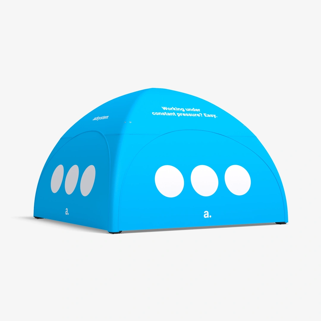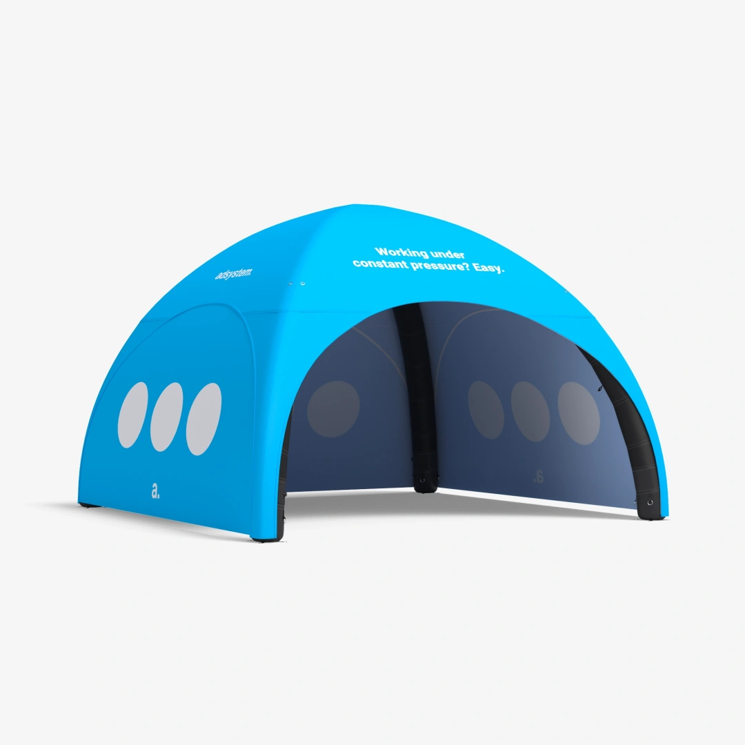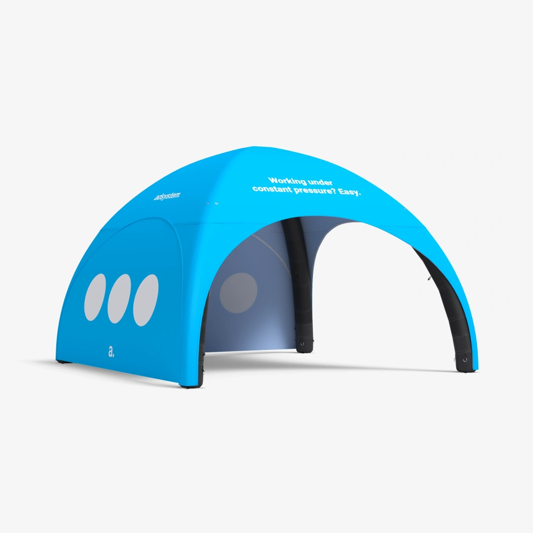 A tenda insuflável adTent Air Premium não é apenas uma solução para a proteção contra condições meteorológicas adversas, mas também um meio publicitário altamente eficaz. O material que cobre a estrutura pode ser personalizado com a sua comunicação visual, transformando a tenda publicitária num elemento atrativo que chama a atenção do público e atrai visitantes ao seu stand. Esta tenda insuflável baseia-se numa estrutura de pressão constante, que mantém o nível de ar estável graças ás suas válvulas especiais.