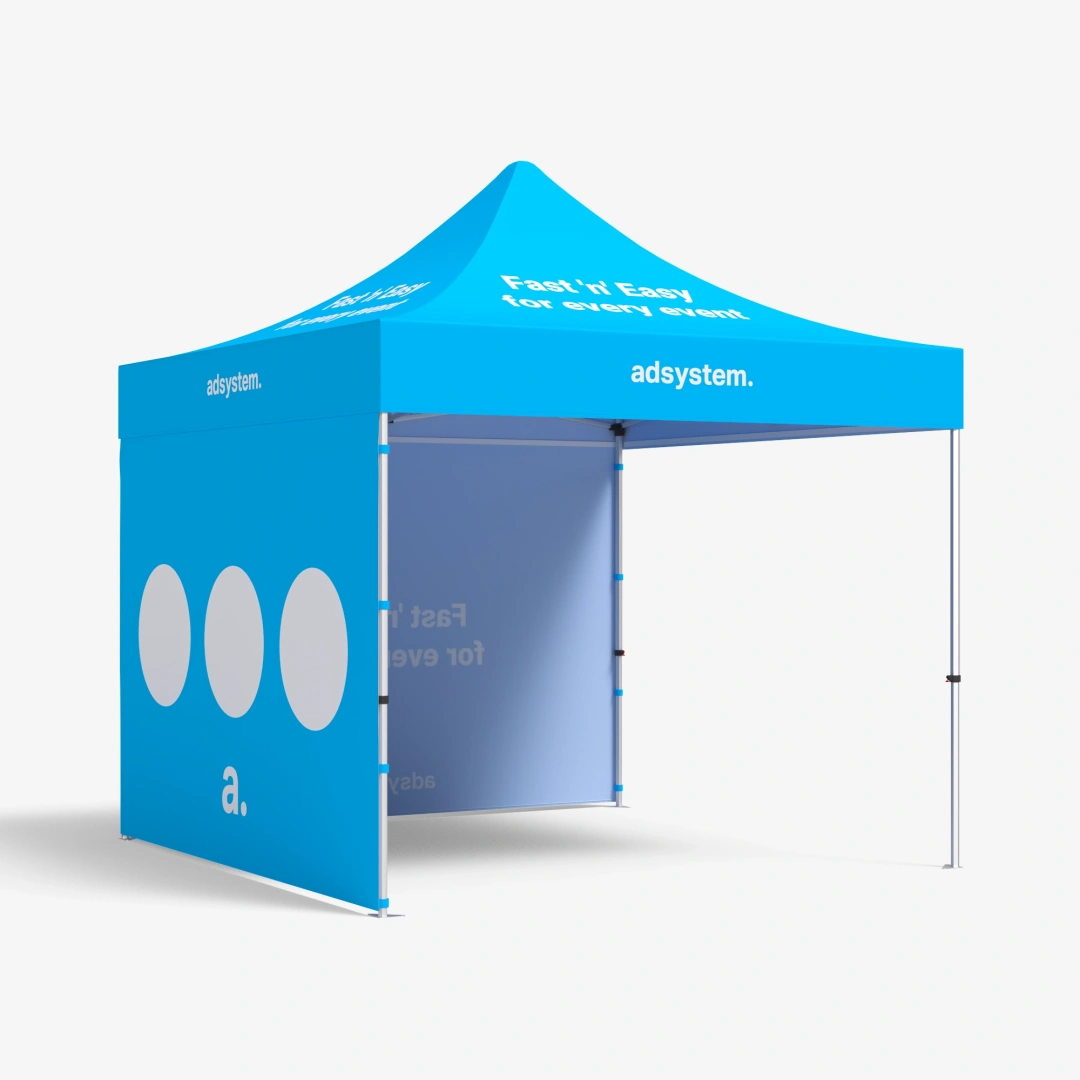 As tendas personalizadas para eventos adTent Express são produtos versáteis, ideais para diferentes tipos de eventos ao ar livre ou em espaços interiores. Estas tendas permitem proteger o seu stand do sol e da chuva, além de definir os limites do espaço. Com impressões personalizadas dos gráficos da sua marca, as tendas tornam-se um suporte publicitário eficaz, chamando a atenção e atraindo visitantes ao seu stand. O produto é composto com uma estrutura, cujo teto é composto por varas de alumínio conectadas entre elas, permitindo uma montagem rápida e prática, num sistema POP UP. O conjunto inclui ainda uma bolsa flexível com rodas, que facilita o transporte e o armazenamento da tenda.