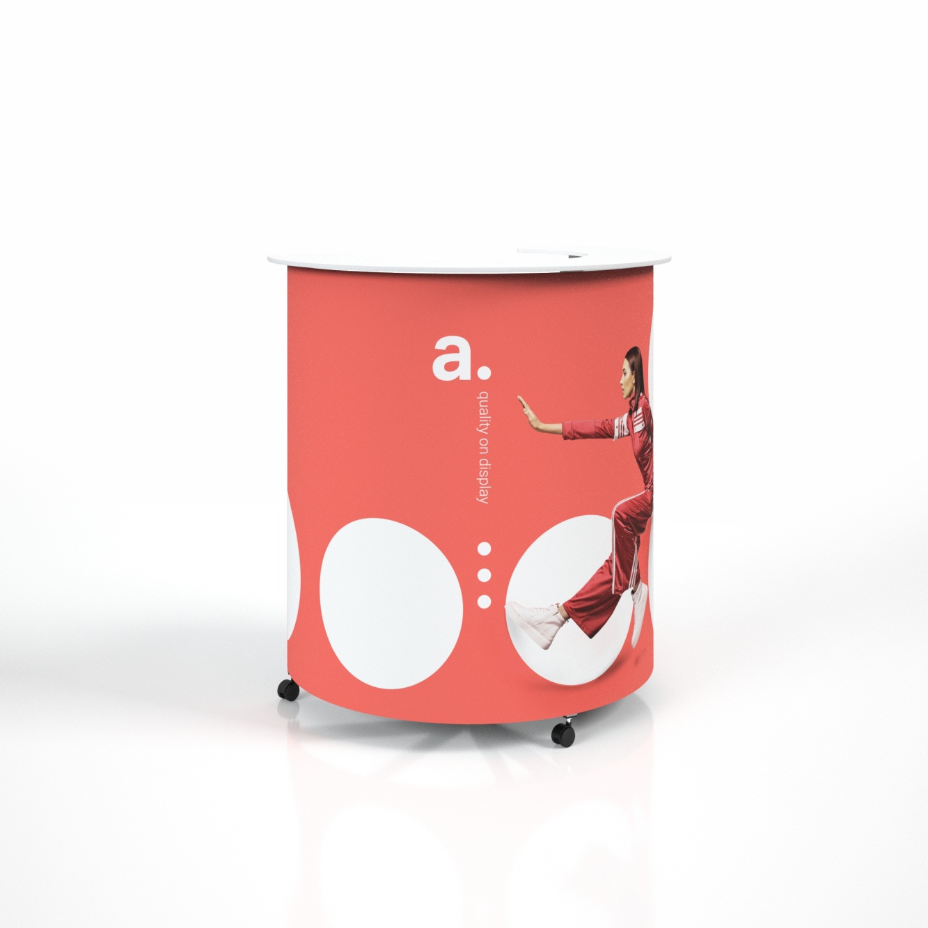 adTribune Hit C é um balcão promocional personalizado que se destaca pela sua estrutura com duplo tampo, separando a área das tarefas da área de apresentação. Ideal para conferências e feiras, oferece um espaço profissional para exposições.