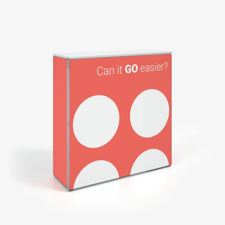 adTribune Starter é um balcão promocional desmontável com design simples e funcional. Possui um tampo robusto e uma prateleira espaçosa para armazenar objetos pessoais e materiais adicionais. Três lados são revestidos com impressões têxteis, tornando-o um suporte publicitário eficaz. Leve e portátil, garante fácil transporte e montagem rápida.