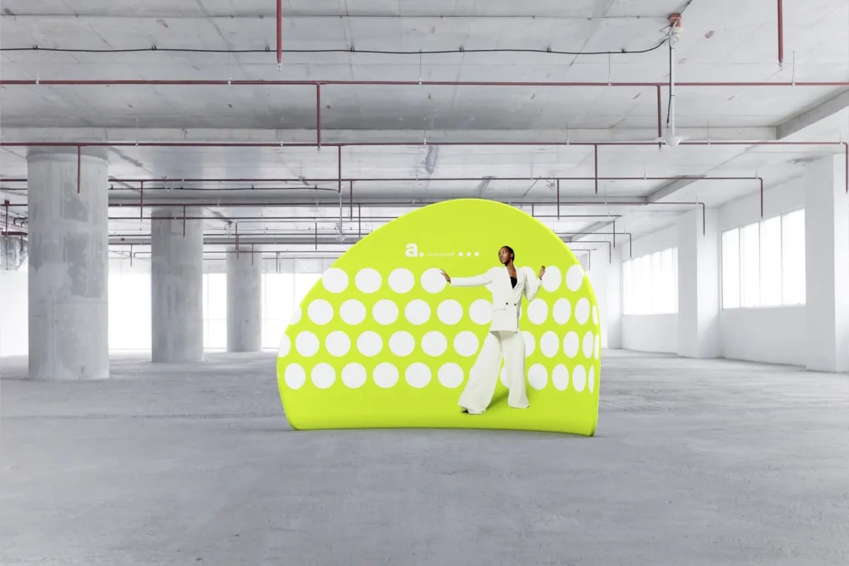 adWall Vario Peak é um promotional backdrop com decoração em tecido que se destaca pelo seu formato exclusivo e pela capacidade de personalização. Ideal para promover a sua marca, é leve, portátil e fácil de montar.
