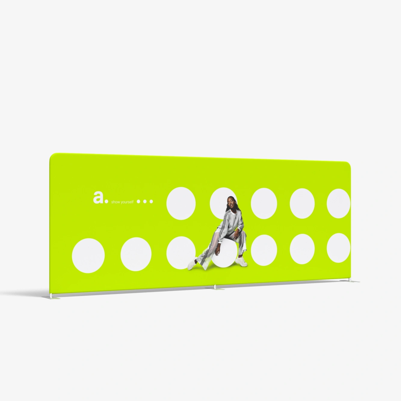 O backdrop adWall Vario Straight Premium é uma ferramenta de marketing versátil que pode ser utilizada de várias maneiras para promover a sua marca. O produto pode servir como photowall ou como parte de um stand em feiras, mas também pode ser usado na decoração de escritórios ou estabelecimentos comerciais. A sua estrutura é leve e resistente – o diâmetro do tubo é de 43 mm.
