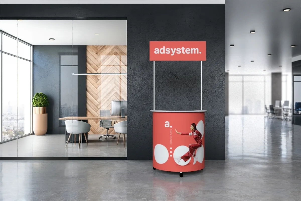 adBox Hit C é um balcão promocional moderno com design de tampo duplo, separando a área de trabalho da zona de degustação. Perfeito para ações promocionais em lojas, garante total conforto no uso.