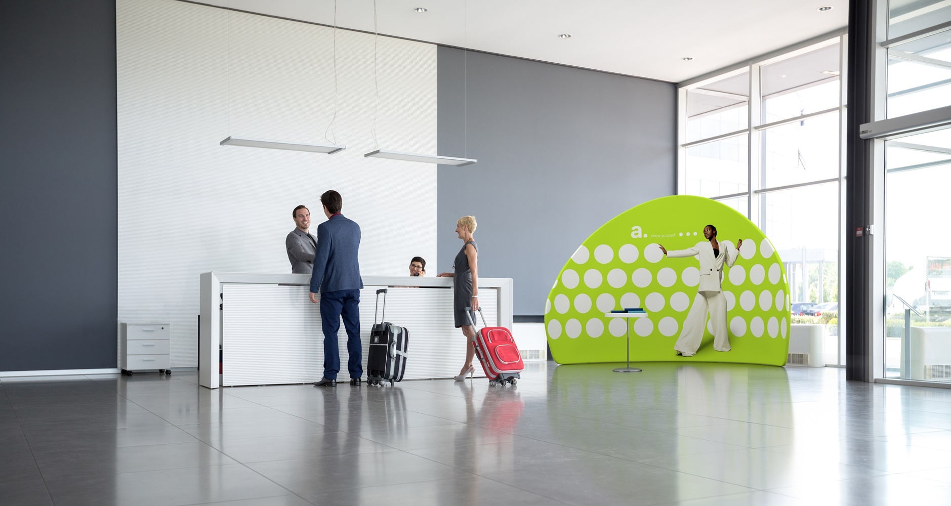 Receção: O promotional backdrop adWall Vario Peak é perfeito para receções, criando um fundo elegante com o logótipo da empresa, impresso no tecido.