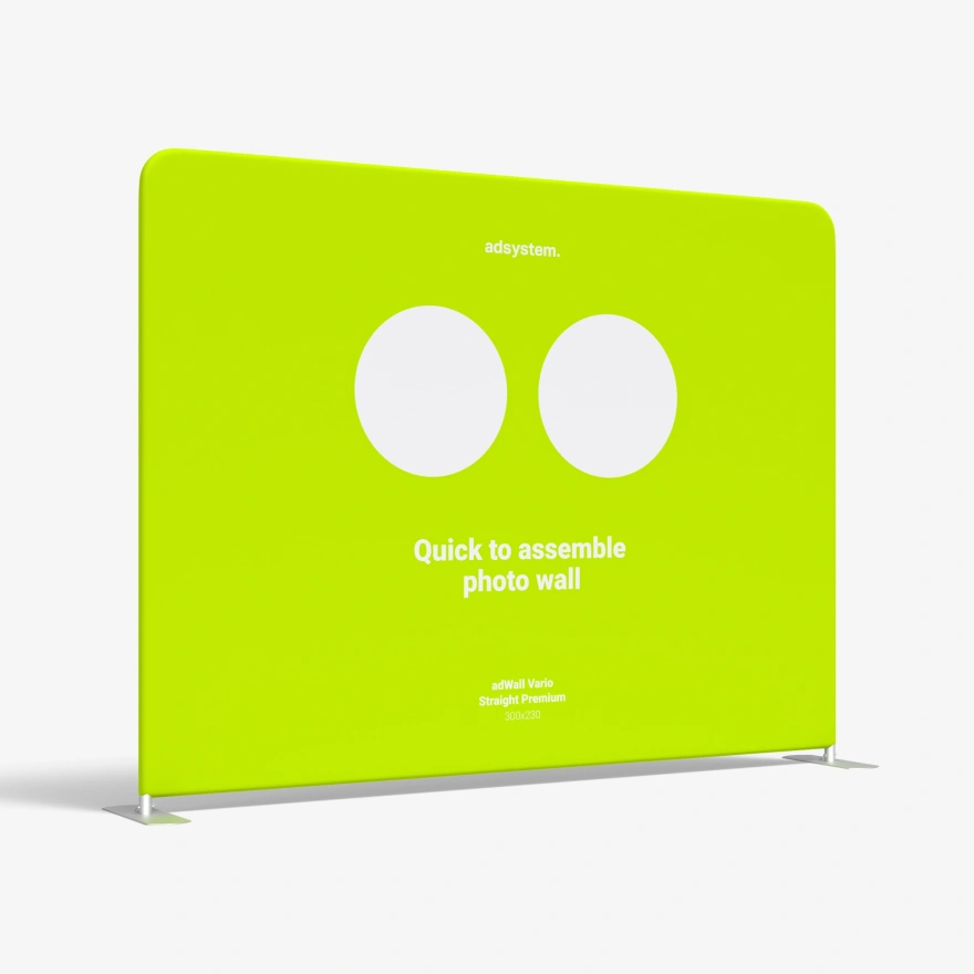 O backdrop adWall Vario Straight Premium é uma ferramenta de marketing versátil que pode ser utilizada de várias maneiras para promover a sua marca. O produto pode servir como photowall ou como parte de um stand em feiras, mas também pode ser usado na decoração de escritórios ou estabelecimentos comerciais. A sua estrutura é leve e resistente – o diâmetro do tubo é de 43 mm.