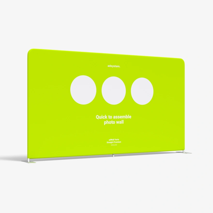 O backdrop adWall Vario Straight Premium é uma ferramenta de marketing versátil que pode ser utilizada de várias maneiras para promover a sua marca. O produto pode servir como photowall ou como parte de um stand em feiras, mas também pode ser usado na decoração de escritórios ou estabelecimentos comerciais. A sua estrutura é leve e resistente – o diâmetro do tubo é de 43 mm.