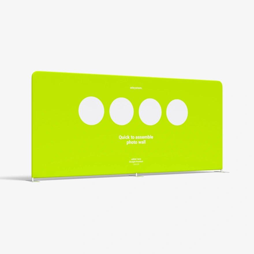 O backdrop adWall Vario Straight Premium é uma ferramenta de marketing versátil que pode ser utilizada de várias maneiras para promover a sua marca. O produto pode servir como photowall ou como parte de um stand em feiras, mas também pode ser usado na decoração de escritórios ou estabelecimentos comerciais. A sua estrutura é leve e resistente – o diâmetro do tubo é de 43 mm.