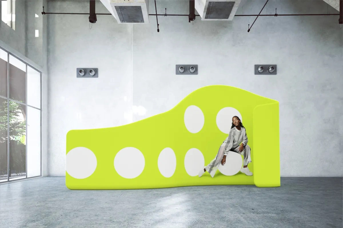 Centros comerciais: o backdrop em forma de onda capta eficazmente a atenção para serviços ou produtos, graças ao seu tamanho generoso e formato apelativo.